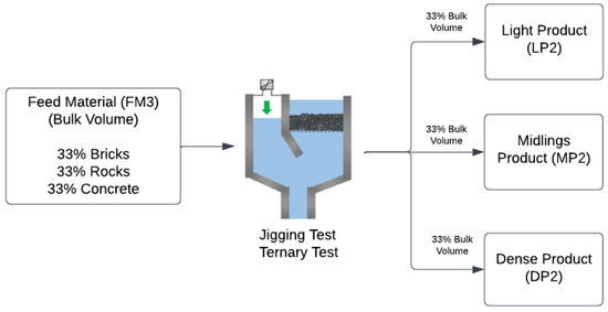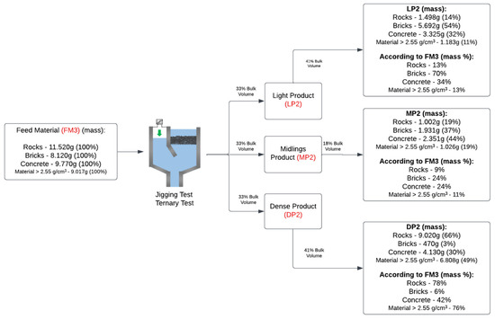 Figure 6 demonstrates the flowchart of the ternary jigging process. The batch test was carried out with rocks from old houses, concrete, and bricks, with 33% of the bulk volume originating from each one, respectively. The test generated three different materials: one light product–LP2, representing 33% of the internal volume of the jig chamber; a middling product-MP2 representing 33% of the internal volume; and a denser product-DP2 representing the last 33% of the internal volume that jig chamber.
