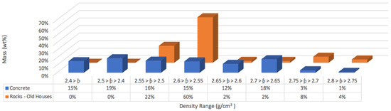 - The rocks from old houses do not have a very relevant density variation due to their basic composition, and more than 80% of the material was within the density range of 2.5–2.6 g/cm3. On the other hand, concrete had a much more relevant density variation, ranging from 2.4 to 2.8 g/cm3;