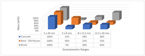 The particle granulometric distribution of the material was determined by sieving the samples and analyzing the material on the 5 mm, 8 mm, 12 mm, and 20 mm sieves as well as the fine aggregates. The granulometric distribution of the material with a 5 × 20 mm range is given in Figure 8. After comminution, 33% of the concrete, 22% of the bricks, and 23% of the rocks remained in the 0 × 5 mm range, being classified as fine aggregates and separated for future studies.