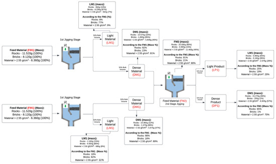 The jigging process was carried out with the feed material-FM3 (Figure 10) on a 24 cm bed height with a mass of 11.520 g of rocks (39% by mass), 8.120 g of bricks (28% by mass), and 9.770 g of concrete (33% by mass), representing 33% of the bulk volume of each material. The feed material (FM3) presented 9.017 g of material with a density greater than 2.55 g/cm3 (31% by mass). Figure 10 demonstrates the flowchart with the values obtained for each product.