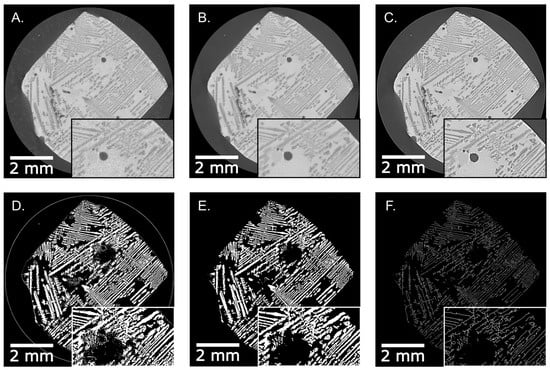 The open-source software Fiji (ImageJ version 1.53b) was used for image processing []. It contains several plugins that are not only suitable for image manipulation but also for microstructure analysis. The raw image stack is first denoised with non-local means denoising. The resulting images are then sharpened at the edges with an unsharp mask, so that the contrast between the phases is improved. Global thresholding is chosen as the segmentation technique to select the target phase []. Lines that remain are also removed by removing outliers. With these steps, on the one hand, lone voxels that have arisen due to the natural image noise are avoided. On the other hand, the structures do not stay softened by sharpening edges with the Unsharp mask. Especially with crystalline minerals that can form clear edges and geometrical shapes, sufficient contrast must be ensured during image processing so that the 3D image reflects the real structure. To analyze the target phase, it is segmented from the raw image by using thresholding. Likewise, to examine the matrix phase, the target phase is subtracted from the overall image and turned into a binary stack.