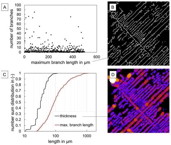 By means of a binarized, skeletonized image, in which the target phase is now labeled white, it is possible to determine the branch thickness and the maximum branch length in 2D. In Figure 3A, the maximum branch length is plotted against the number of branches by analyzing its skeleton representation (Figure 3B). The latter represents the number of branches connected to the longest branch in each case. For this slag material, the number of dendrite branches does not increase with the maximum branch length. A lot of dendrites are only connected to one branch. Since the trunk is very thin and shorter than its branches, the maximum branch length informs about the length of the dendrites connected to the trunk.