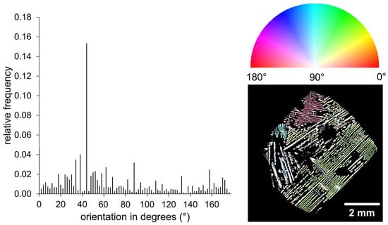 The branches of a dendrite have a preferred orientation based on where the trunk lies. In this slag system, the branches are nearly perpendicular to the trunk. The orientation of the branches is shown in Figure 4. Those values are based on the orientation of the images from the XCT measurement. There, most of the branches have an inclination of 44.5° marked in yellow-green. Their trunk is very thin and marked violet, around 90° to its branches. Branches with the same orientation are found in certain dedicated regions. This indicates that those branches originate from the same trunk and stop growing when they are near other branches from a different trunk. Usually, the strongest material flow is found at the corners and edges of a polyhedral crystal. Skeletal growth is only observed when the material flow is faster than the building blocks or ions arrive at their energetically favorable attachment position. The branches of the dendrites grow in the directions where the fastest crystallization is possible, favoring certain planes. The spaces in between are subsequently filled. This circumstance forces other branches to grow in directions where the slag is still liquified and in which the corresponding free ions still exist to form the target phase.
