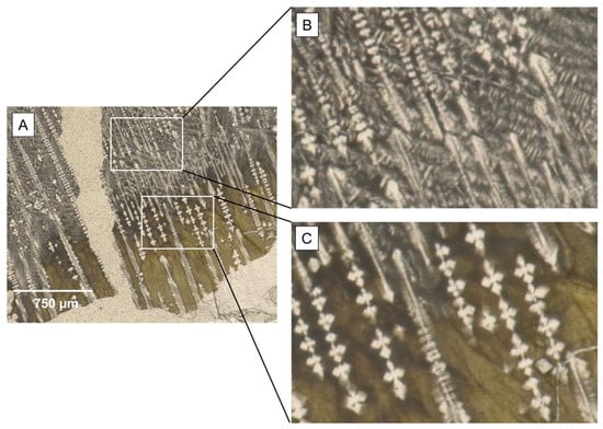 (A) thin section of a lithium aluminate slag particle with zoomed-in sections showing (B) small cuboid-shaped or fine entities; and (C) dendrites consisting of cubical crystals that are connected in a cross arrangement.