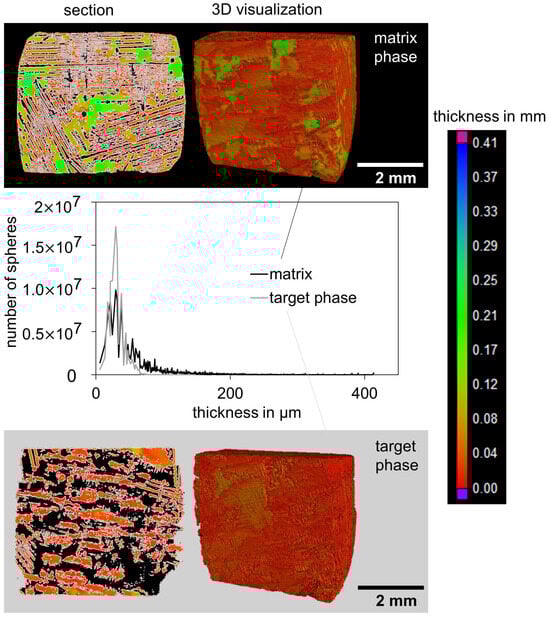 Due to the crystallization mechanism, the connectivity of the dendrites is low in comparison to their length; there is a layer of non-target material, i.e., matrix, in between the different crystals of the target phase. When compared in 3D, the modal thickness of the crystal, deriving from the inscribed sphere method, of the matrix is the same as the target phase. By visualizing a section of the slag particle, it shows an alternation of the two phases as layers of the same size. Although the matrix phase seems to have more regions of high thickness values, shown in yellow to green, these are mainly concentrated at the ends of differently oriented dendrites. The target phase itself is not needle-shaped but consists of uneven layers interconnected throughout the slag particle, as seen in the 3D representation. Therefore, the matrix is a phase that is not entirely split by the target phase layers, and therefore it is completely connected as a continuous phase.