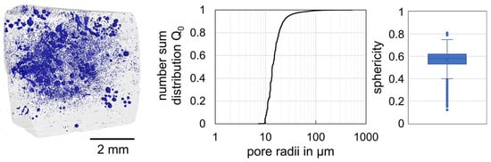 To characterize the micro-scale pores within the slag particle, the solids are selected as regions of interest and inverted so that only the gas phases are considered for the pore space analysis. A certain amount of non-spherical-shaped pores, with most of them having a sphericity between 0.53 and 0.62, is shown in Figure 8. Most of the pore radii amount to about 10–30 µm and overlap with the finer thickness range of the dendrites. Figure 8 also shows a 3D visualization of pores within the slag particle, where it can be seen that the pores are distributed randomly. In general, large and fine pores can be found in every region. The size and distribution of the pores are related to crystal growth, the concentration of ions in the melt to grow crystals, and external conditions such as temperature and pressure. Fast-growing crystals may not have enough time to reach their final arrangement, resulting in defects and voids within the crystal structure. These voids act as pores and are randomly distributed in the slag product. Slow-growing crystals or those with a low ion concentration will have sufficient time to arrange properly, which can result in fewer and smaller pores.