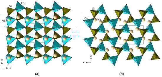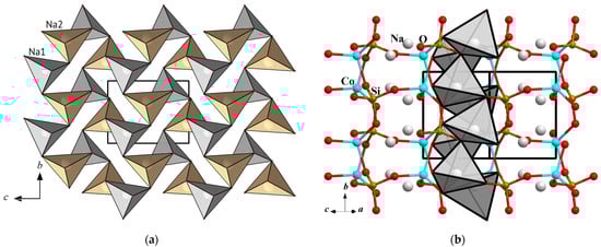 Liberite and Na2CoSiO4 belong to a large group of compounds with the general formula A2MeXO4, where A+ represents the alkaline cations Li or Na; Me2+ represents Zn, Mn, Co, Mg, and Be; and X4+ represents the semimetals Si or Ge. The crystal structures of A2MeXO4 phases are based on a distorted hexagonal close-packing of oxygen atoms, with half of the tetrahedral voids occupied by the A, Me, and X atoms. The rich crystal chemistry of this family results from variations in the occupancy of the tetrahedral voids and the bonding of A+-, Me2+-, and X4+-centered tetrahedra. Accordingly, the A2MeXO4 compounds crystallize in several polymorphic modifications, mainly in the monoclinic and orthorhombic space groups P21, P21/n, Pn, Pmnb, Pmn21, and Pbn21 []. The good Na+/Li+ ionic conductivity of the A2MeXO4 family arises from its structural peculiarities. Channels within the anionic tetrahedral framework allow for the migration of alkali metal cations. In these compounds, the Na+/Li+ deintercalation is compensated by two electrons per Me2+ transition metal []. Moreover, the presence of transition metal atoms determines the magnetic properties of these phases due to the super-exchange magnetic interactions between Me2+ cations through the [XO4]4− anionic tetrahedra [,].