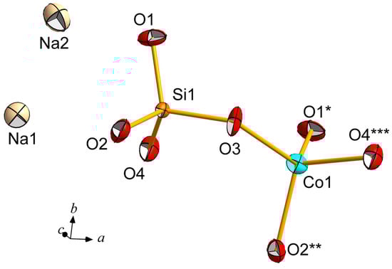 A symmetrically independent fragment of the crystal structure of Na2CoSiO4 (I); thermal ellipsoids are shown with 90% probability. Symmetry operations: (*) 0.5 + x, 1 − y, and −0.5 + z; (**) 0.5 + x, −y, and −0.5 + z; (***) 1 + x, y, and z.