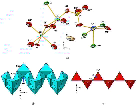 According to the established nomenclature, copper oxo-salts with “additional” oxygen ligands (not shared with anionic complexes) are called oxo-cuprates. They are often described within the anion-centered approach [,]. In the case of the Na2Cu3O(Cu0.8Na0.2)(PO4)2Cl, oxo-centered [OCu4] tetrahedra form pyroxene-like chains [O2Cu6]∝ (Figure 4c) that belong to the “zweier chain topological type”, according to the classification in []. In the structure (II), these chains, extended along the c-axis of the unit cell, are separated from each other by Na-, P-, and Cu+-centered polyhedra.