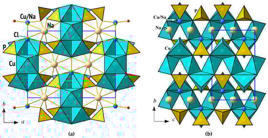 The crystal structure of Na2Cu3O(Cu0.8Na0.2)(PO4)2Cl displayed along the z (a) and x (b) axes.