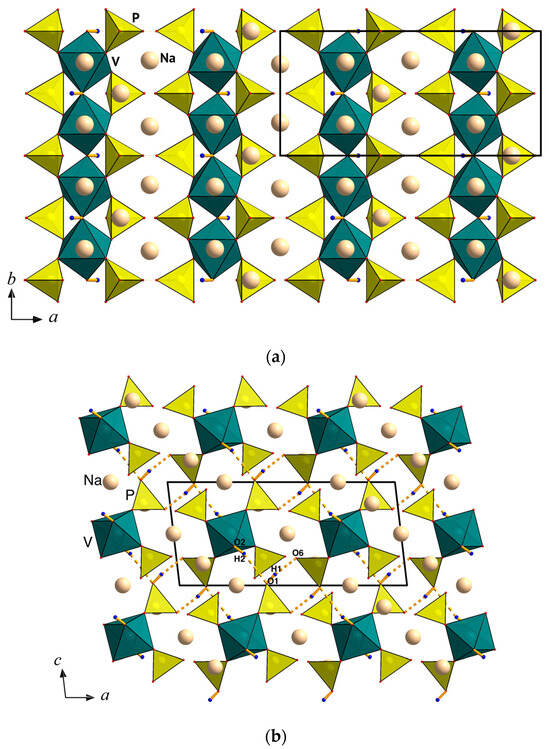 In the crystal structure of the Na3V(OH)(HPO4)(PO4) compound, V-centered octahedra share O2 vertices with the hydroxyl group to form chains of the 21 symmetry, parallel to the b axis of the unit cell. Each PO4 tetrahedron shares two O vertices adjacent to the chain VO4(OH)2 octahedra, resulting in the arrangement of one-periodic mixed-type anionic fragments of [V(OH)(HPO4)(PO4)]3−. These negatively charged ribbons interconnect in a framework via Na+ ions and hydrogen bonds (Figure 6). The hydrogen bonds system includes the atom O1, which serves as a donor to form an O1—H1···..O6 bond of medium strength, in accordance with the D···A distance (Table 7). The O1 atoms also acts as an acceptor in the significantly weaker hydrogen bond O2—H2···..O1 (Figure 6b).