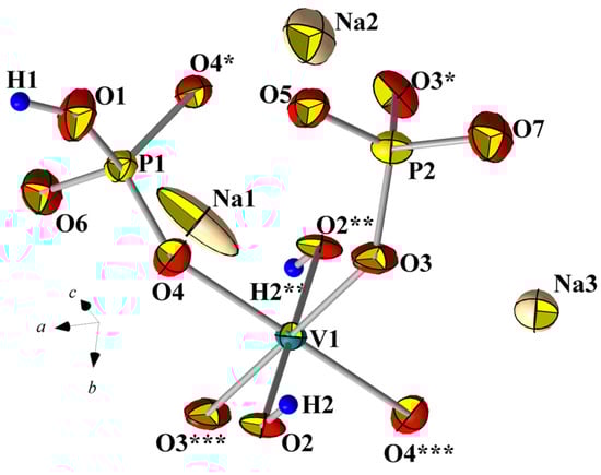 An independent fragment of the crystal structure of Na3V(OH)(HPO4)(PO4) (III) with thermal ellipsoids represented at the 90% probability level. Symmetry operations: (*) x, 1 − y, z; (**) 1.5 − x, −0.5+y, −z; (***) 1.5 − x, 1.5 − y, −z.