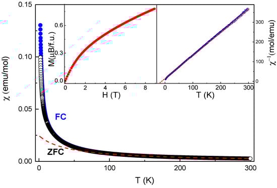 Magnetization M was measured using a Quantum Design automated PPMS-9T (Physical Property Measurement System) equipped with a Vibrating Sample Magnetometer (VSM). The temperature dependences of the magnetic susceptibility were taken in field-cooled (FC) and zero-field-cooled (ZFC) regimes at B = 0.1 T in the temperature range of 2–300 K. Through the temperature region, ZFC and FC curves almost perfectly coincided (Figure 8). At elevated temperatures, the χ(T) curves followed the Curie–Weiss law with the addition of the following temperature independent term χ0: