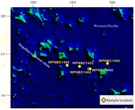 The Fe-Mn nodules utilized in this study were gathered from the IBSWP (see Figure 1). The Magellan seamount area is situated in the western Pacific Ocean, adjacent to the Mariana Trench in the west and extending to the Central Pacific Basin in the east. It is separated from the Marcus Wake seamount area in the north by the Pigafetta Basin and the eastern Mariana Basin in the south. The Magellan seamount area is situated at the forefront of the plate subduction zone. The structure in the area is complex. The seamounts are primarily distributed in a northwest direction due to structural control. The seamounts are mostly isolated peak, bimodal, and multi-peak mesas. The flat top has a depth of 1400–1600 m, and the base has a water depth of around 5000–6000 m. The slope of the mountain top is generally less than 2°. The sediment on the seabed in the study area primarily consists of deep-sea clay, and the bottom seawater is predominantly influenced by the Antarctic bottom water (AABW) (He et al., 2001; Huang et al., 2022) [24,28].
