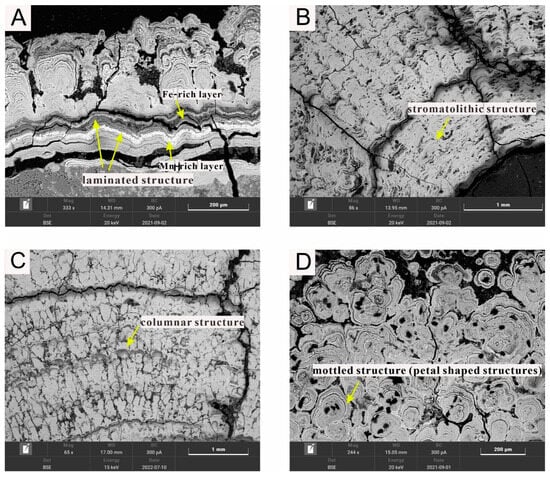 The stromatolithic structure (Figure 3B) consists of alternating microlayers of amorphous or crystalline Fe-Mn oxides/hydroxides and clay minerals.