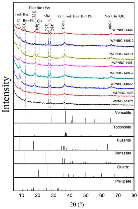 According to the whole-rock XRD patterns (Figure 4), the minerals of the Fe-Mn nodules from the IBSWP are primarily composed of vernadite, todorokite, buserite, birnessite, phillipsite, and quartz. In the XRD patterns, the main d values of vernadite (00-015-0604) and birnessite (00-043-1456) were 7.08 Å (001), 2.45 Å (121), and 1.42 Å (002); todorokite (00-038-0475) and buserite (00-032-1128)’s d values were 2.45 Å (121), 4.80 Å (321), and 9.80 Å (100); phillipsite (00-051-1497)’s d values were 7.08 Å (001), 3.20 Å (024), and 2.45 Å (121), and quartz (00-033-1161)’s d values were 1.42 Å (002), 3.34 Å (101), and 4.26 Å (100).