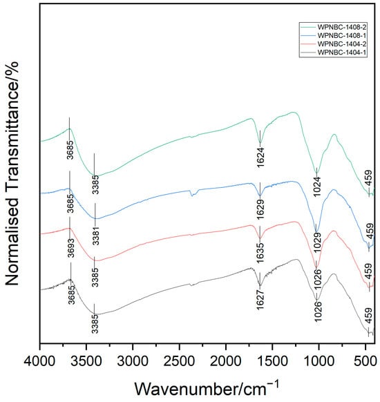 The infrared spectra of the Fe-Mn nodules from the IBSWP are shown in Figure 5, and the spectral characteristics of the four samples are relatively consistent. In the characteristic frequency range of the spectrum (4000–1300 cm−1), there are absorption peaks at 3381–3385 cm−1, which are recognized as the stretching vibration bands of the neutral H2O molecules (3650–2700 cm−1). The absorption peaks at 1624–1635 cm−1 are bending vibration bands of neutral H2O molecules (1680–1560 cm−1); the dense absorption peak of 1580~1320 cm−1 is the absorption band of O-H and inorganic C-O (1480–1580 cm−1, Marino et al., 2019) [29].