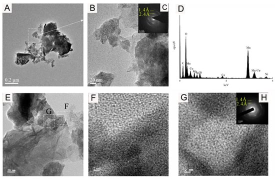 XRD and FT-IR analyses revealed that the mineral particles in the Fe-Mn nodules were satisfactory, but the degree of crystallization was low. Therefore, transmission electron microscopy (TEM) and energy-dispersive X-ray spectroscopy (EDS) were further used to conduct a more detailed mineralogical analysis of the Fe-Mn nodules on a smaller scale.