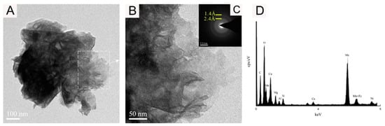 Bright-field TEM (A,B), SAED images (C), and EDS images (D) showing the vernadite nanoparticle of sample WPNBC1404-2.