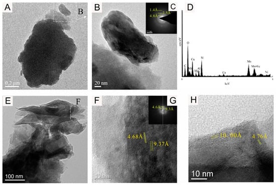 The TEM-EDS results are shown in Figure 6, Figure 7, Figure 8 and Figure 9. The analysis shows that the mineral micromorphology mainly presents the micrometer or even the nanometer particles, and the Fe-Mn minerals consist mainly of layered and fibrous nanoscale minerals. According to the EDS spectroscopy, in addition to the Fe-Mn minerals, there may also be colloidal minerals of Al or Si. The prominent signal peak of the Cu element in the EDS spectroscopy is commonly attributed to the presence of the copper mesh carrier in transmission electron microscopy experiments.