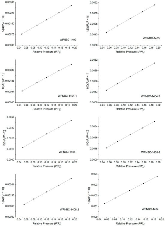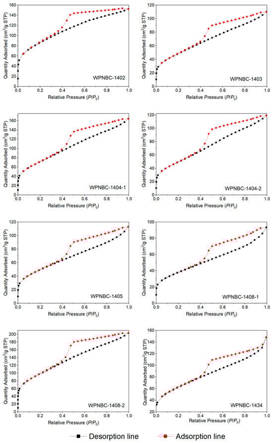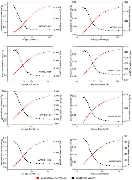 The adsorption surface areas, pore volumes, and pore size distributions of the Fe-Mn nodules from the IBSWP can be determined by analyzing the isothermal adsorption and desorption isotherms. The adsorption and desorption isotherms of the samples are shown in Figure 10. All eight Fe-Mn nodules exhibit similar isotherm trends. In the range of 0 < P/P0 < 0.02, the adsorption isotherms (shown as the black line in Figure 10) exhibit a tendency to approach the y-axis with a steep slope. This indicates that the sample initially deviates from the fast adsorption isotherms (the black line in Figure 10) towards the y-axis with a high slope, suggesting that the sample initially adsorbs nitrogen at a rapid rate, leading to a quick increase in nitrogen adsorption capacity. This phenomenon indicates the presence of a large number of microporous structures in the sample (Zou, 2018) [51]. When the P/P0 approaches 1.0, the nitrogen adsorption capacity still does not show saturation, indicating that the sample may have large pores that cannot be characterized by nitrogen adsorption (Huang et al., 2022) [52]. During the subsequent nitrogen desorption process, the nitrogen adsorption amount in the desorption isotherms (the red line in Figure 10) decreased as the pressure decreased. However, the desorption isotherms did not align with the adsorption isotherms until the P/P0 reached 0.4. The desorption isotherms and adsorption isotherms formed a hysteresis loop at P/P0 = 0.4~1.0, indicating that the sample powder exhibited capillary condensation during the nitrogen adsorption process. The phenomenon of capillary condensation is typically associated with the shape and size of the pores in the sample. The relative pressure of the P/P0 at the separation point of the adsorption and desorption isotherms in the hysteresis loop ranges between 0.3 and 0.4, indicating a relatively low pressure. This reflects the smaller pore structure of the sample. The nitrogen adsorption capacity of each sample exhibits significant differences, with the following order: WPNBC1408-2 > WPNBC1404-1 > WPNBC1402 > WPNBC1404-2 > WPNBC1405 > WPNBC1403 > WPNBC1408-1. Among them, the nitrogen adsorption capacities of WPNBC1403, WPNBC1404-2, and WPNBC1405 are nearly identical, suggesting that these three samples have similar pore structures. However, sample WPNBC1408-1 has the lowest nitrogen adsorption capacity, indicating its reduced porosity. The pore structure of the porous materials can be characterized by analyzing the adsorption and desorption isotherms of the samples and the shape of the hysteresis loop.