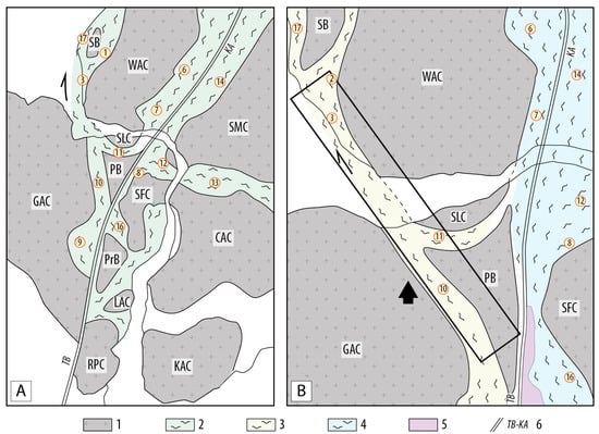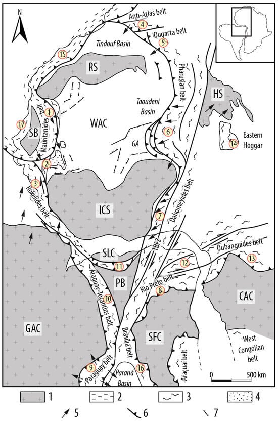 - The Borborema belts (12) are located in northeastern Brazil and comprise four different zones or belts including, from north to south: the “Ceará belt” (or Ceará central domain) oriented NE-SW and linked to the Hoggar belt, the “Central Fan belt” or “Rio Grande do Norte domain” with NE-SW orientation and linked to the eastern Hoggar (Aïr massif), the “Patos—Pernambuco shear zone” [56] oriented W-E and linked to the central African fault zone (Amadaoua fault zone), the “Southern frontal zone” including the “Sergipano fold belt” oriented WNW-ESE and linked to the Oubanguide belt located to the north of the CAC. Every belt has a different geodynamic evolution. For example, the northern Ceará belt is characterized by a subduction to the south and a syn-collisional stage at 640 Ma [57], while the southern Sergipano fold belt records a subduction to the north with a syn-collision stage between 605 and 540 Ma [58].