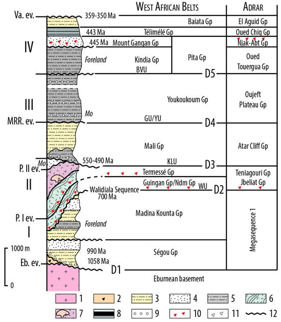 - The Dahomeyides belt (7) presents an evolution similar to the “Adrar des Iforas belt” with only one orogenic event (Panafrican II). The foreland units consist of the sedimentary Bombouaka and Oti groups, which crop out in the Volta basin [36,37]. The “nappes” were emplaced between 607 and 579 Ma in the Buem units [38,39], and the suture dips to the east. The post-collisional stage had begun around 575 Ma.