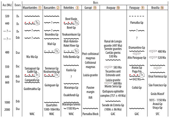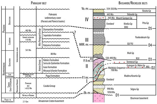 - The Paraguay belt (9) is located along the Amazonian Craton and separated from the Aaraguay belt by sediments of the Bananal Basin [43]. This belt has been studied at least since the 1990s [46], and recent investigations allow to better constrain its stratigraphic evolution [18] and propose a correlation with the Bassaride and Rokelide belts (Figure 3). The oldest stratigraphic unit consists of Neoproterozoic Cuiabá Group, which was deformed around 652 Ma. This group is capped by the Puga Formation deposited during the Marinoan glacial event around 635 Ma [5]. Tillites of the Puga Formation are capped by the Araras Group comprising limestones and argilites. The Araras Group is overlain by the early Cambrian Alto Paraguay Group which comprises conglomerates, sandstones and shales with “skolithos” burrows. Granitic intrusions (e.g., São Vicente granite) emplaced at 518 Ma [47] provide a minimum age for this group. The last stage consists in the deposition of sediments from the Ordovician to the Devonian in the Paraná Basin [48]. In the Paraguay belt the metamorphism decreases from east to west. Structures present a double vergence: toward the Amazonian Craton in the western side and toward the east in the internal Cuiabá and Araras groups to the east. Little is known about the first orogenic event (900 to 650 Ma) and the D1 deformation ascribed to this orogeny is only recorded in the Cuiabá group. Other deformation events (D2 and D3) imprinted all groups until the Alto Paraguay Group. The geodynamic evolution of this belt is still debated between an intracontinental ensialic model [49] and a classical subduction model with an island arc in the Goiás massif [50]. Another hypothesis considers the Paraguay belt as the foreland of the Brasília belt at about 600 Ma [24].