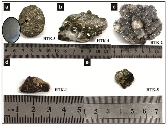 Macroscopic characteristics of pyrite samples: (a) HTK-3 occurs as concretions, and a concentric ring structure can be found on the longitudinal section, possibly having undergone synsedimentation. (b) HTK-4 occurs as a cube particle, and the pyrite occurs in association with quartz. (c) Sample HTK-2 is cubic and granular, with pyrite grains scattered in the crystal clusters. (d) Sample HTK-1 shows a pyritohedron shape, coexisting with calcite. (e) Sample HTK-5 is octahedral, in symbiosis with sphalerite which can be observed in red fluorescence.