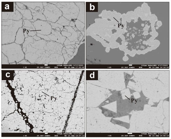 A previous investigation has shown pyrite generated in hydrothermal deposits was associated with other sulfide, oxide, quartz, and other minerals, and sometimes huge accumulations of pyrite deposits could be formed [3]. The crystal morphology of hydrothermal pyrite showed the crystallization habits have changed continuously with the evolution of mineralization. Generally, when the sulfur fugacity in the hydrothermal fluid is high, pyrite is prone to form “e” or “o” crystal shape, accompanied by complex polymorphic crystals. However, under high oxygen fugacity and low sulfur fugacity conditions, this is conducive to the growth of an “a” single crystal [4]. In metamorphic rocks, pyrite is often formed as a newborn product of metamorphism, while in sedimentary rocks, coal strata and sedimentary deposits, pyrite is often produced in massive, nodules or lenticular form, and its formation is inextricably linked to the organic matter. Pyrite nodules and agglomerates were dominant during the sedimentary period, and a total of three types of framboids pyrite, autoclasts and pyrite-accounted filling organisms were observed microscopically [1].