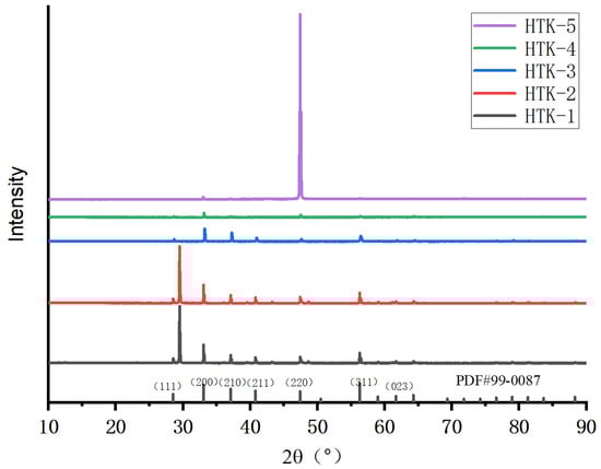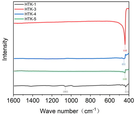 Infrared absorption spectra of each sample. The absorption peaks of different intensities were found at 440 cm−1, and the absorption intensity of HTK-3 was stronger. A weak absorption peak at 1065 cm−1 can be found in sample HTK-1, and the absorption curves of HTK-4 and HTK-5 are relatively gentle.