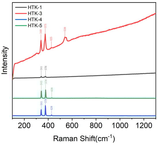 Raman spectra of each sample. Samples show different intensity absorption peaks around 341 cm−1 and 376 cm−1, among which the HTK-3 sample also shows a strong absorption peak at 538 cm−1.
