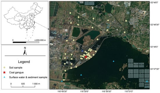 - You, M.; Hu, Y.; Wang, Z.; Zhang, W. Characterization and Ecological Risk Assessment of Toxic Metal Contaminants in the Soil Around the Coal Gangue Hill in Huainan, Central China. Water Air Soil Pollut. 2023, 234, 667. [Google Scholar] [CrossRef]