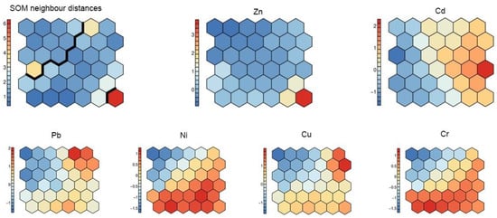 The component plane output of SOM analysis is shown in Figure 2. Each SOM matrix consisted of the component values of 36 neurons, and the SOM plane used a color gradient to indicate the importance of the variables transmitted by each neuron. In the component plane, similar colors indicate positive correlations between variables, while different colors indicate negative correlations. By comparing the color gradients of the SOM, it is possible to visualize the qualitatively weighted relational information between nodes and to classify the SHM into three interpretable groups. As shown in Figure 2, certain similar patterns can be distinguished. For example, chromium and nickel show similar color gradients and their distribution patterns show the highest concentrations in the lower right, indicating a strong positive correlation between these two elements. In contrast to the distributions of the other HMs, zinc shows a marked difference in its topological distribution pattern, with relatively low zinc values over most of the map, except for one high neuron in the lower right, suggesting a different mechanism influencing changes in zinc concentration. Cd is highly concentrated in the right half of the map, similar to the compositional planar distributions of copper and lead, suggesting that these HMs share the same mechanism of concentration change. The spatial distributions of chromium and nickel are extremely similar and they are strongly correlated.