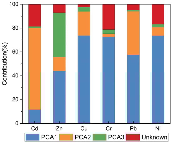 The contributions of each factor to the heavy metal elements are shown in Figure 3, including contributions from three pollution sources determined by PCA and one unknown pollution source. The contribution rates for PCA1, PCA2, PCA3, and the unknown source were 55.48%, 24.44%, 8.91%, and 11.86%, respectively.