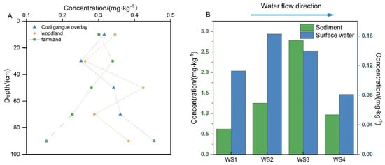 (A) Variation in Cd content in different regional profiles; (B) Cd content in surface water and sediments of the subsidence area in the research area.