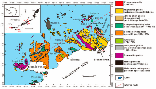 - Stüwe, K.; Braun, H.; Peer, H. Geology and structure of the Larsemann Hills area, Prydz Bay, East Antarctica. Aust. J. Earth Sci. 1989, 36, 219–241. [Google Scholar] [CrossRef]