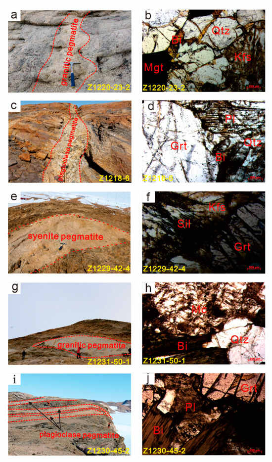 Field photographs (a,c,e,g,i) show the relationships between pegmatite and their surrounding rocks; microphotographs (b,d,f,h,j) show the contact relationship between rock-forming minerals. The mineral abbreviations is: Qtz (quartz), Bi (biotite), Kfs (K-feldspar), Pl (plagioclase), Grt (garnet), Mgt (magnetite), Mc (microcline).