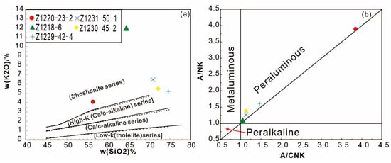 K2O-SiO2 ((a) solid line after Peccerillo and Taylor, 1976 [59]; dashed line after Middlemost, 1985 [60]) and A/CNK-A/NK ((b), A/NK = Al2O3/(Na2O + K2O), A/CNK = Al2O3/(CaO + Na2O + K2O) after Maniar and Piccoli, 1989 [61]) plots for pegmatites from Larsemann Hills.