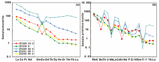 Chondrite-normalized REE patterns ((a) normalization values after Sun and McDonough, 1989 [63]) and primitive mantle normalized trace element patterns ((b), normalization values after McDonough and Sun, 1995 [64]) for pegmatites from Larsemann Hills.