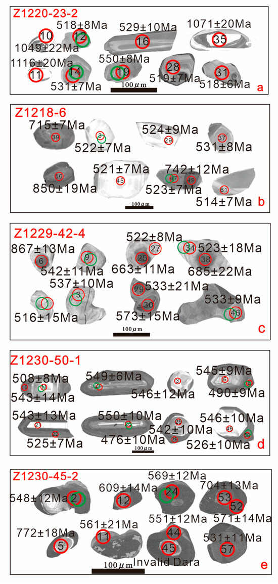 The CL images of representative zircons from the samples (a–e) (The red solid circles represent the U-Pb test points. The green solid circles represent the Hf test points.).