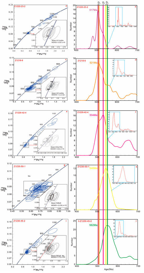 In the granitic pegmatite (Z1230-50-1), zircons are observed as granular or columnar, with particle sizes ranging from 100 to 200 μm and a length/width ratio of 1:1–3:1. Cathodoluminescence (CL) images show that some zircon grains exhibit a nucleus–edge structure, featuring a wide inherited nucleus and a slight accretive edge (Figure 5d). Most zircons are lighter, displaying pronounced oscillatory bands and darker edges. A total of 44 U-Pb measurements were conducted on zircon grains, and the 206Pb/238U and 207Pb/235U ratios exhibit good concordance (Figure 6g, Table 3). The weighted average age of the 206Pb/238U peak in the zircon core is 546 ± 6 Ma (MSWD = 0.076, n = 15) (Figure 6h). The 206Pb/238U age of the zircon accretive edge ranges from 463 to 534 Ma, indicating apparent traces of fluid action during later stages, likely representing the new metamorphic edge of pegmatite zircon after the transformation of subsequent thermal events.