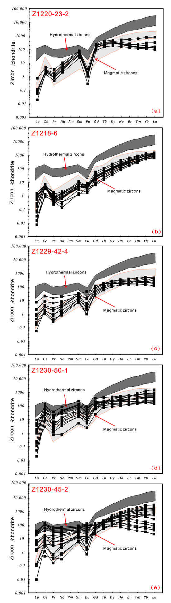 Chondrite-normalized REE patterns (normalization values after Sun and McDonough, 1989 [63] and Hoskin, 2005 [68]) of the new magmatic zircons from the samples. (a) Z1220-23-2; (b) Z1218-6; (c) Z1229-42-4; (d) Z1230-50-1; (e) Z1230-45-2.