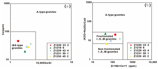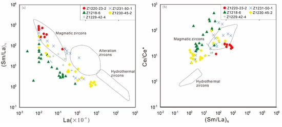 All the zircons of the five samples (ΣREE, ppm) exhibit LREE depletion and the left-dip characteristics of HREE enrichment (Figure 7a–e). The majority of surveyed sites have zircons that display obvious negative Eu anomalies and positive Ce anomalies, and most have test data with Th/U values between 0.1 and 1 (Table 4), indicative of magmatic zircon characteristics. In the zircon-type discrimination diagram, most zircons within the pegmatites fall within the range associated with magmatic zircons–alteration zircons (Figure 8a,b) [67].
