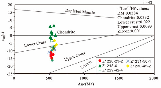 Zircon, a key mineral for U–Pb geochronology, is a stable mineral [74,75], and its Lu-Hf isotopes are extensively used in geochemical studies to understand the origin of magma and specific magmatic processes. Previous studies have shown that the genesis of magmatic rocks has two modes: (1) the partial melting of preexisting crustal material, in which the εHf(t) value of the zircons in magmatic rocks is lower than that in chondrite; (2) new crustal material or partially melted mantle material, in which the zircon εHf(t) value of magmatic rocks is higher than that of chondrite [9]. This provides conclusive evidence for identifying source areas [76]. The tDM2 age of zircon can offer a more precise reflection of the average retention age of the source material [77].