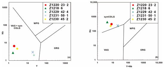 Discrimination diagrams of the tectonic environment of granitic pegmatites in the Larsemann Hills (a,b). Abbreviations: syn-collision granite (syn-COLG), volcanic arc granite (VAG), with plate granite (WPG), and normal and anomalous ocean ridge granite (ORG) (based on Pearce et al., 1984 [73]).