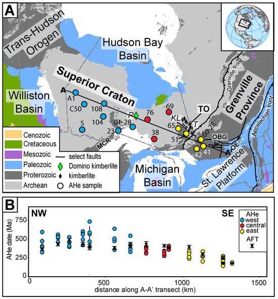 (A) Simplified geologic map of the southern Canadian Shield, showing major geologic provinces and intracratonic basins, significant kimberlite fields (P—Pagwachuan field with the Domino kimberlite, KL—Kirkland Lake, T—Timiskaming), and locations of other geologic features mentioned in the text. MCR—Midcontinent Rift, TO—Timiskaming outlier, OBG—Ottawa–Bonnechere graben, OE—Ottawa embayment. Section line A–A’ marks location of transect line used in (B). (B) New single-grain AHe dates for basement samples versus distance along section line A–A’. AHe uncertainties are 2σ propagated analytical uncertainties. In many cases, the AHe date uncertainty is smaller than the symbol. AFT data are from [13], with uncertainty reported at 1σ.