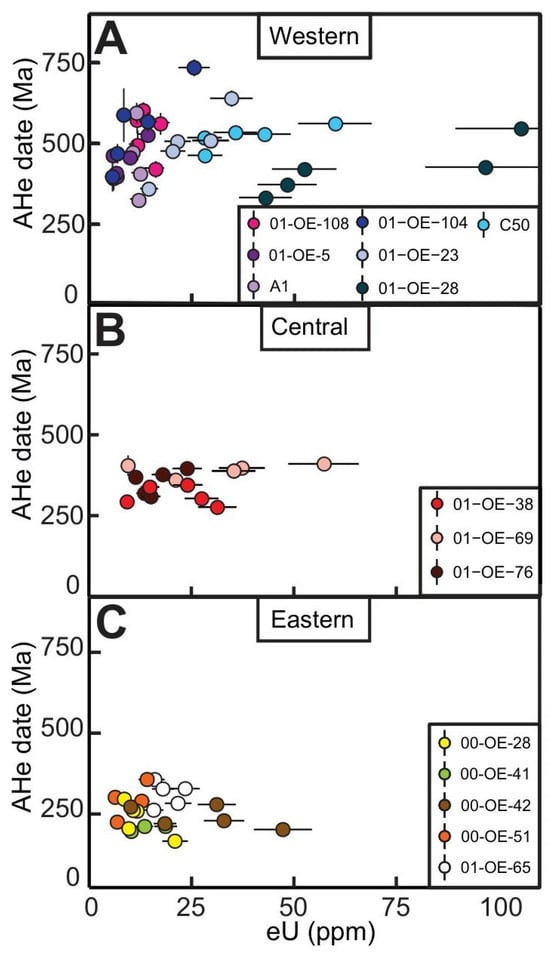 AHe date vs. eU plots for basement samples from the (A) western, (B) central, and (C) eastern parts of the transect. AHe uncertainties are 2σ propagated analytical uncertainties. eU uncertainties are 15% of the eU value.