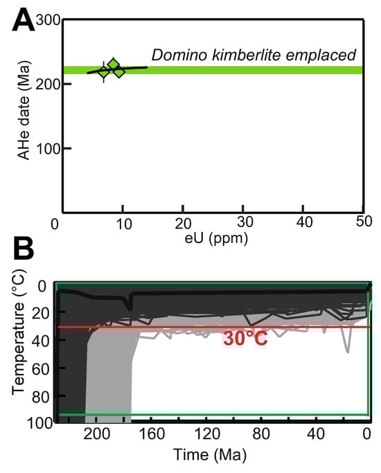 The Domino kimberlite sample, located in the middle of our transect, yielded three AHe dates with a mean and 1σ standard error of 222 Ma ± 4 Ma (Figure 2D). This result overlaps with the pipe’s emplacement age of 220 ± 7.8 Ma [29].