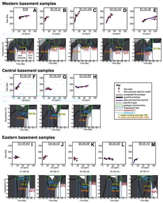 Results of thermal history modeling of AHe data for basement samples. (A–M) AHe date vs. eU plots (top panels) and corresponding thermal history simulations (bottom panels). AHe uncertainties are 2σ propagated analytical uncertainties. See Table S5 for additional information regarding model inputs and their rationale and Figure S2 for the full temperature and time duration of the models with all imposed tT constraints from geologic data. During the Paleozoic–early Mesozoic burial interval, a red line is shown for the maximum temperature if it is below the upper bound of the imposed tT constraint box. During the late Mesozoic–Cenozoic burial interval, a red line is shown for the maximum temperature for those models not restricted to <30 °C (this restriction was applied to the tT simulations of the central basement samples because of the Domino kimberlite constraint as described in the text). For both intervals, a blue line is shown for the minimum temperature if it is >10 °C. The constraint points from which these are taken are shown in Figure S4. Cooling times and maximum/minimum temperatures are derived from the good-fit tT paths. Plots are truncated at 700 Ma and 150 °C for visual clarity; full durations are shown in Figure S5. Two western samples (A1, 01-OE-108) with substantial AHe data dispersion were not simulated.